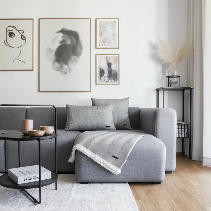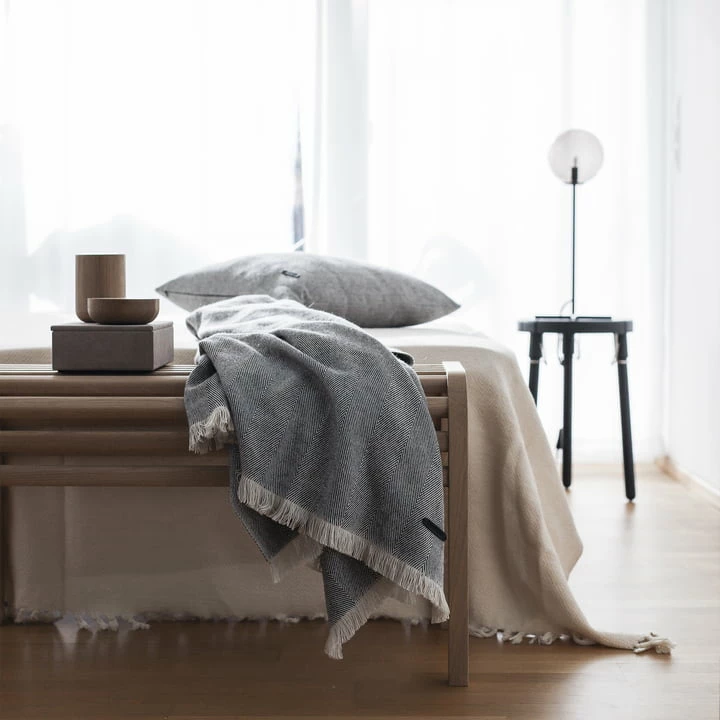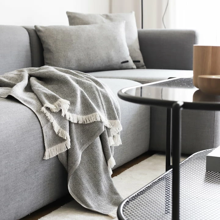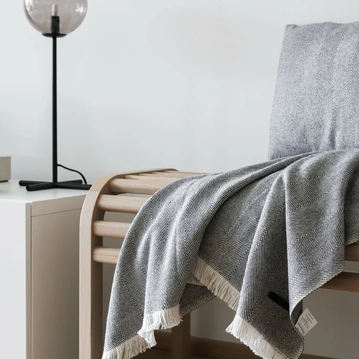 De Twill Weave deken van Andersen Furniture zorgt voor gezelligheid op de bank in de woonkamer. Het decoratieve visgraatpatroon is een blikvanger op de fauteuil en het bed en wordt aangevuld met verfijnde franjes aan de zijkanten.