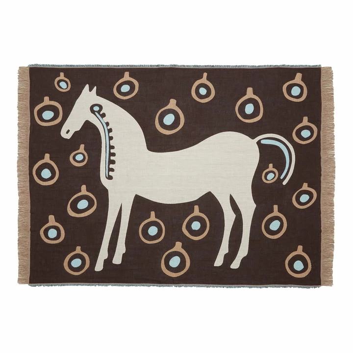 De deken Musta Tamma van Marimekko is een zachte deken met print, gemaakt van katoen en linnen. 60% van het katoen in dit product is van gerecycleerde oorsprong. Voorzien van fijne franjes aan alle zijden en gemaakt met een jacquard breisel straalt deze deken comfort en warmte uit in de kamer. Het is een heerlijk kleed voor op de bank of een knusse aanvulling op het bed. Dankzij het paardenmotief is het perfect als geschenk voor kleine paardenliefhebbers.