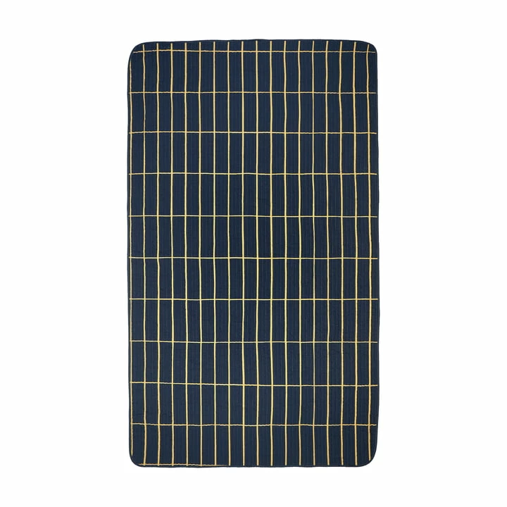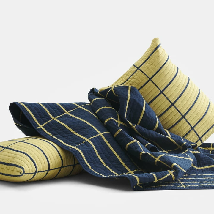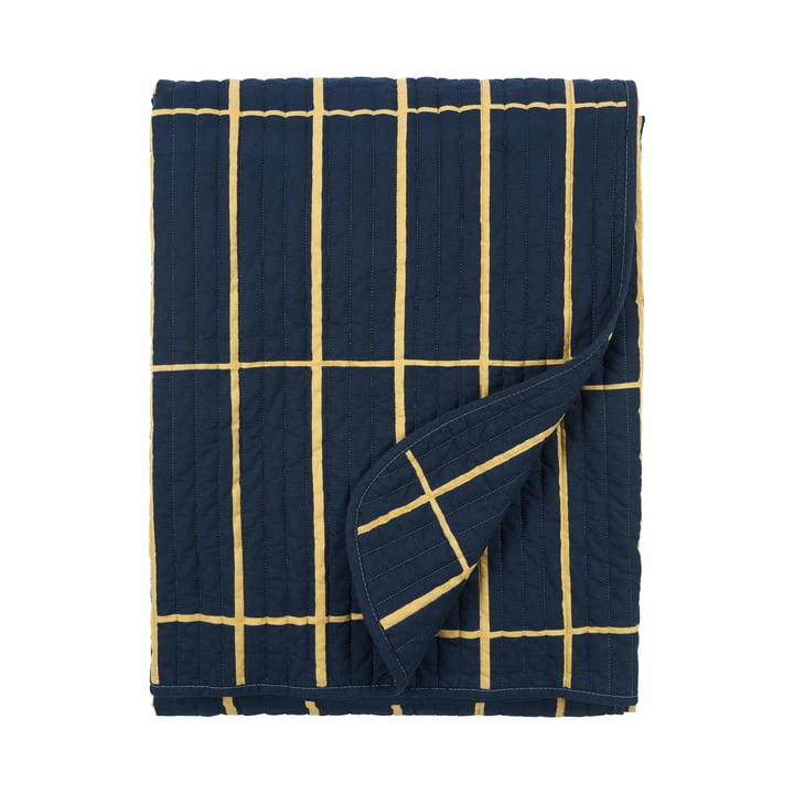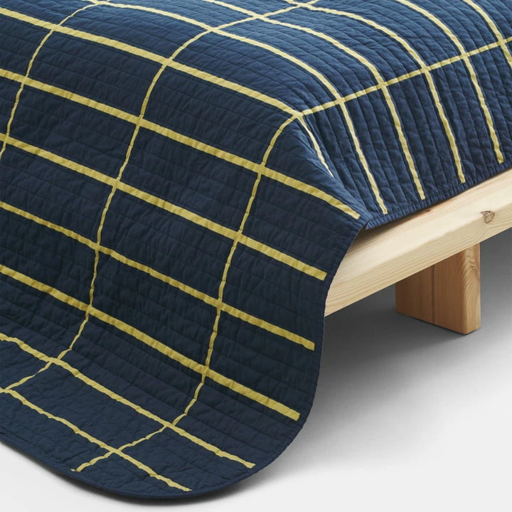 De doorgestikte sprei van Marimekko met het Tiiliskivi -patroon is gemaakt van katoen met een binnenvoering van gerecycled polyester.
